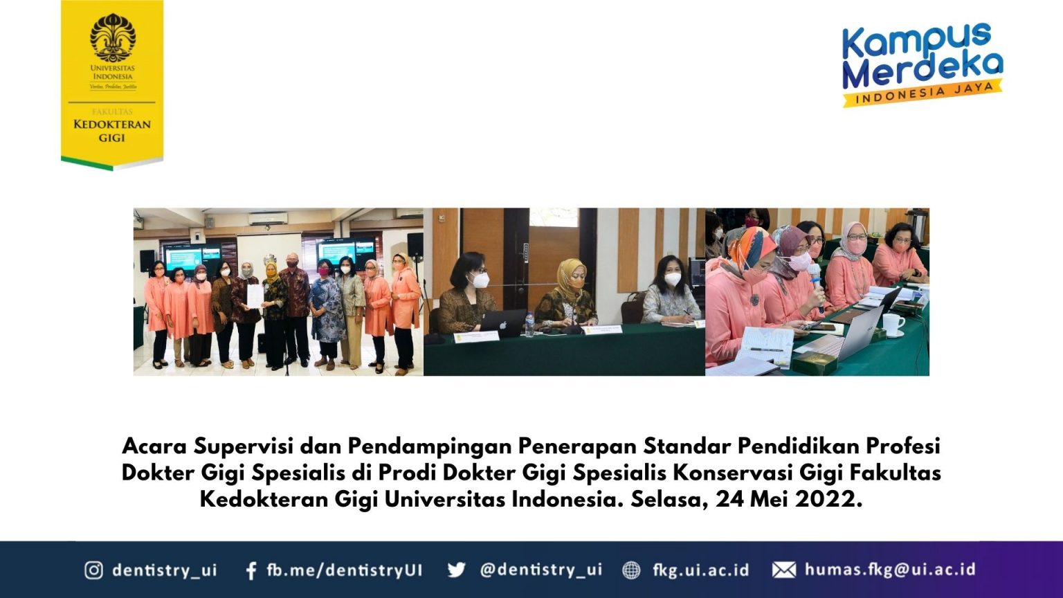 Konsil Kedokteran Indonesia (KKI) Melakukan Supervisi & Pendampingan Penerapan Standar Pendidikan Profesi Dokter Gigi Spesialis Di Program Studi Spesialis Ilmu Konservasi Gigi Fakultas Kedokteran Gigi Universitas Indonesia, secara luring, Selasa, 24 Mei 2022 di Gedung B FKG UI, Salemba, Jakarta Pusat.