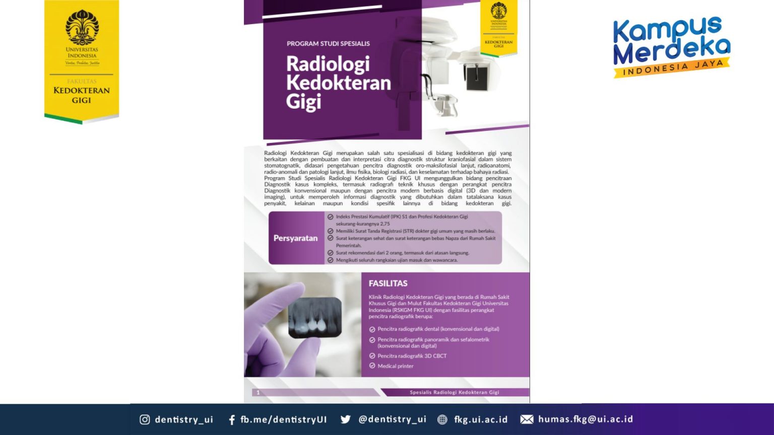 Program Studi Spesialis Radiologi Kedokteran Gigi FKG UI mengunggulkan bidang pencitraan diagnostik kasus kompleks, termasuk radiografi teknik khusus dengan perangkat pencitra diagnostik konvensional maupun dengan pencitra modern berbasis digital (3D dan modern imaging), untuk memperoleh informasi diagnostik yang dibutuhkan dalam tatalaksana kasus penyakit, kelainan maupun kondisi spesifik lainnya di bidang kedokteran gigi.