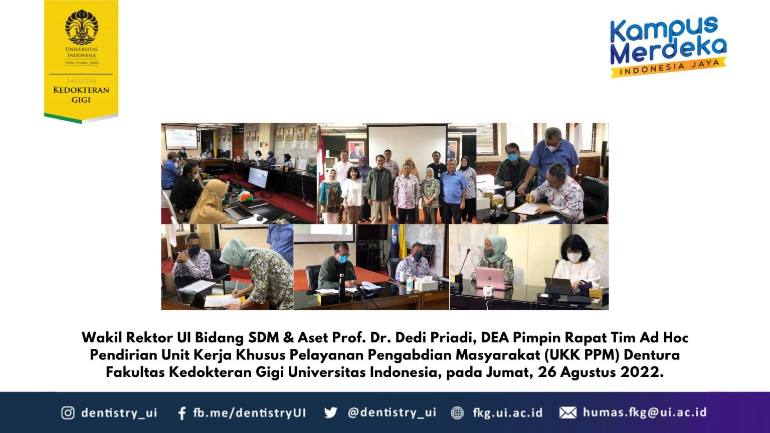 Rapat Tim Ad Hoc pembentukan Unit Kerja Khusus Pelayanan dan Pengabdian Masyarakat (UKK PPM) Dentura FKG UI dipimpin oleh Wakil Rektor UI bidang SDM & Aset Prof. Dr. Ir. Dedi Priadi, DEA., yang dihadiri oleh Direktur Pengelolaan dan Pengembangan Unit-Unit Usaha (DPPU) T.M. Zakir Sjakur Machmud, M. Ec., Ph.D., tim DPPU dan perwakilan dari bidang keuangan dan logistik UI.