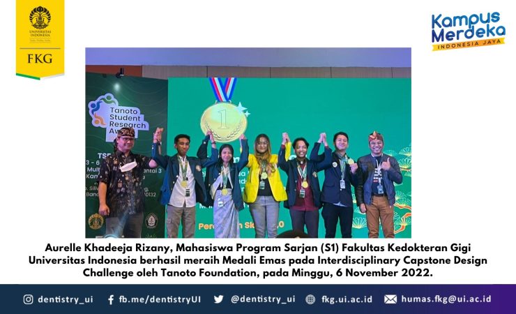 Aurelle Khadeeja Rizany, Mahasiswa Program Sarjan (S1) Fakultas Kedokteran Gigi Universitas Indonesia berhasil meraih Medali Emas pada Interdisciplinary Capstone Design Challenge oleh Tanoto Foundation, pada Minggu, 6 November 2022