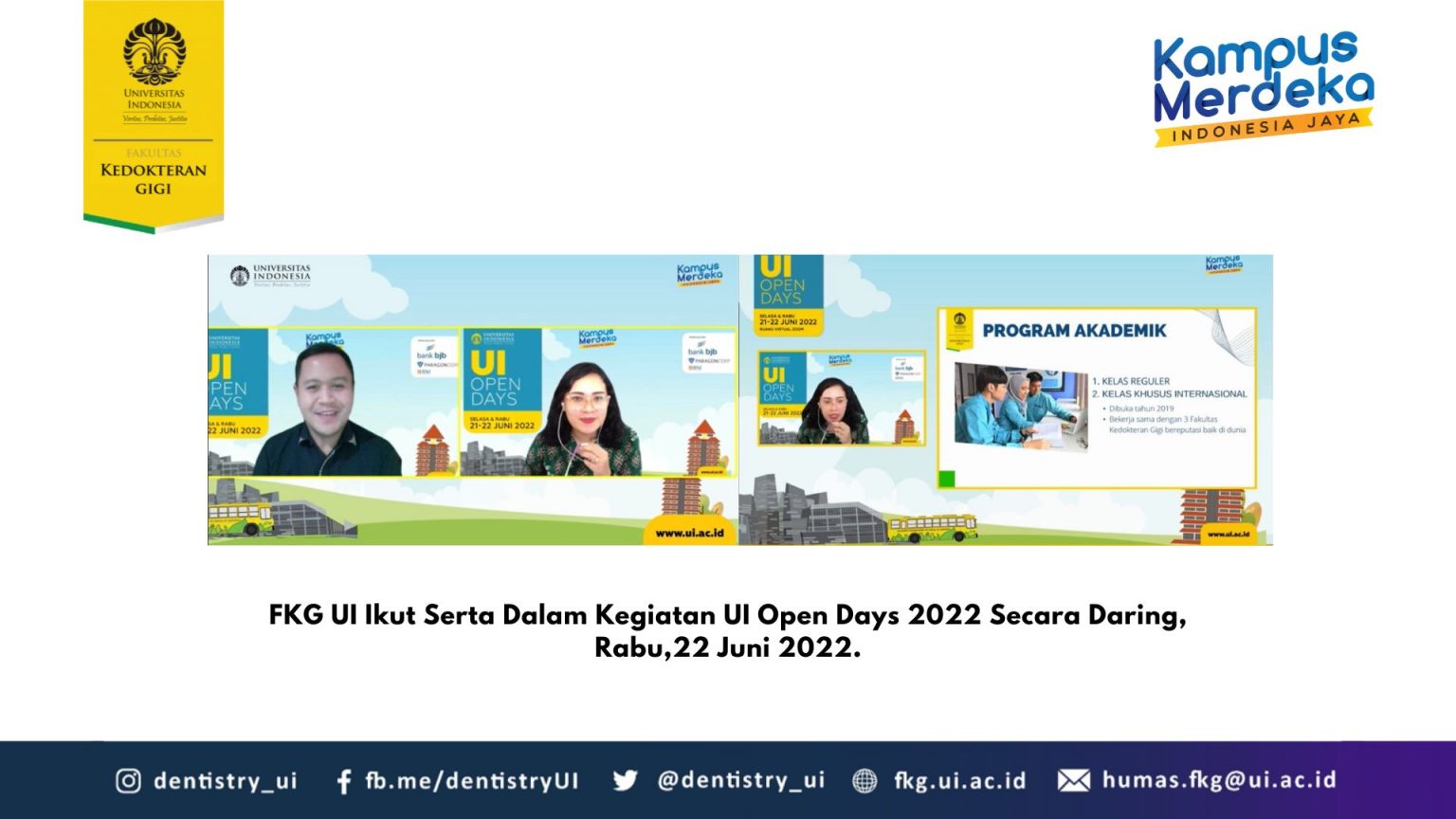 Fakultas Kedokteran Gigi Universitas Indonesia Ikut Serta Dalam Kegiatan “ UI Open Days “ Secara Daring, Rabu, 22 Juni 2022. Tahun ini, FKG UI menghadirkan narasumber yaitu drg. Citra Fragrantia Theodorea, M.Si., Ph.D. ( Ketua Program Studi S1) dan didampingi oleh Reska Herlambang, M.Ikom., C.IB ( Kepala Hubungan Masyarakat). Saat sesi presentasi, drg. Citra menjelaskan...Read More