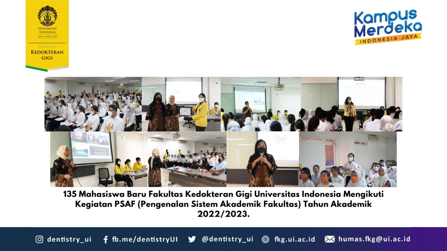 [PSAF FKG UI Tahun Akademik 2022/2023] Dalam rangka mempersiapkan mahasiswa baru menghadapi masa awal perkuliahaan pada semester gasal tahun akademik 2022/2023. Fakultas Kedokteran Gigi Universitas Indonesia bersama BEM FKG UI menyelenggarakan PSAF (Pengenalan Sistem Akademik Fakultas) yang berlangsung dari tanggal 18 s.d 20 Agustus 2022. Melalui kegiatan ini, 135 mahasiswa baru telah diberikan pembekalan materi...Read More