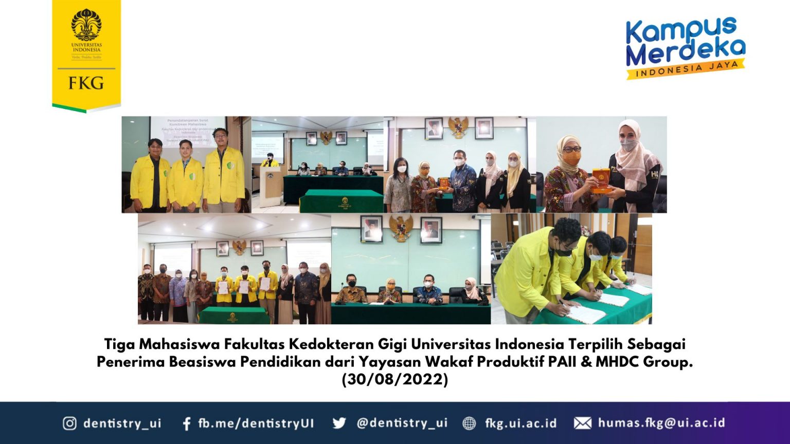 [Beasiswa Mahasiswa FKG UI] Tiga Mahasiswa Profesi Fakultas Kedokteran Gigi Universitas Indonesia Menerima Beasiswa Pendidikan dari Yayasan Wakaf Pengelola Aset Islami Indonesia (PAII) & Mulia Health Dental Clinic (MHDC). Acara penyerahan beasiswa ditandai dengan penandatanganan surat komitmen mahasiswa penerima beasiswa, yang disaksikan oleh Pimpinan FKG UI, Ketua Yayasan PAII serta Founder MHDC Group, pada Selasa,...Read More