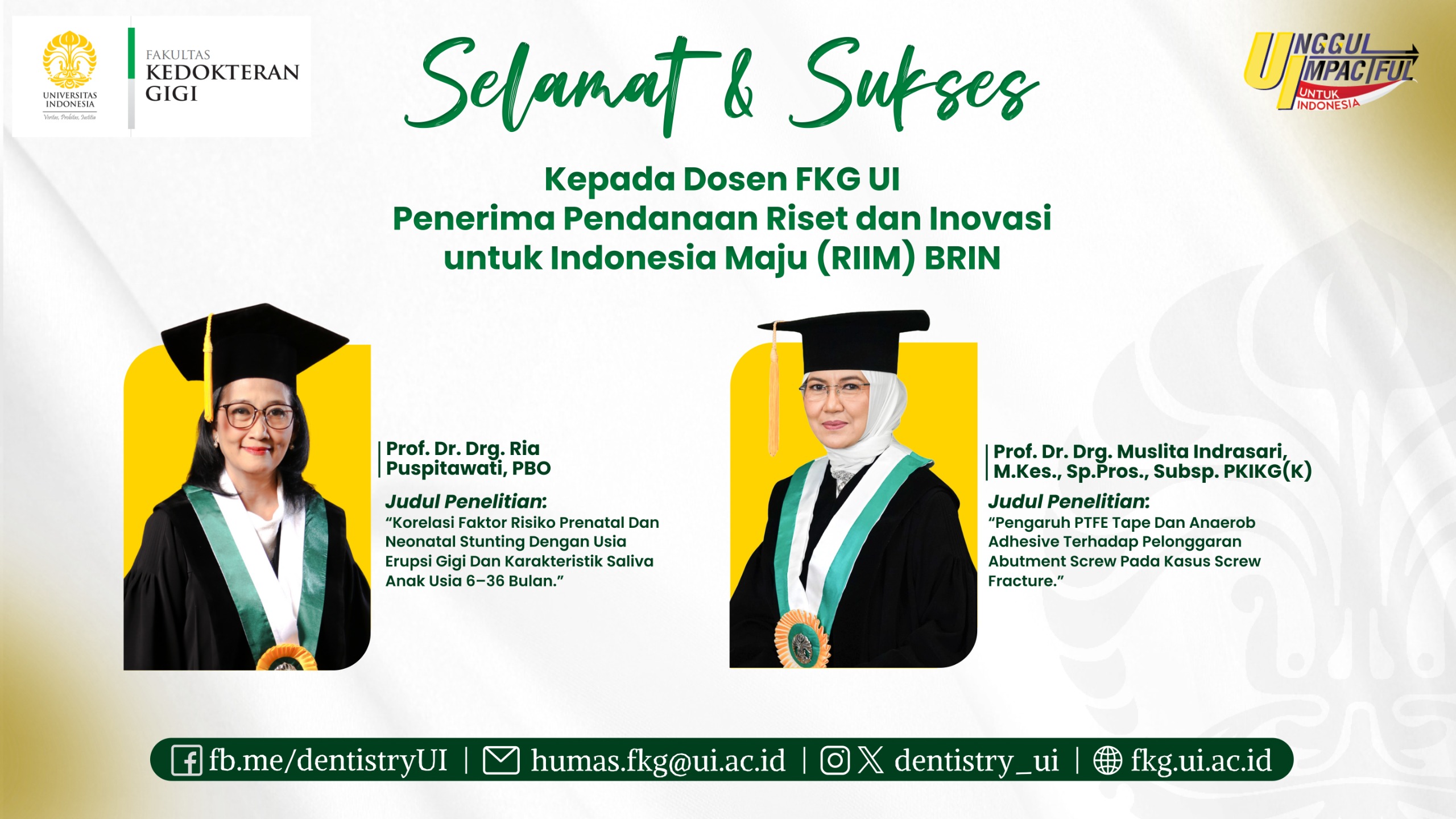 Dua dosen Fakultas Kedokteran Gigi Universitas Indonesia (FKG UI), Prof. Dr. drg. Ria Puspitawati, PBO dan Prof. Dr. drg. Muslita Indrasari, M.Kes., Sp.Pros., Subsp. PKIKG(K), menerima pendanaan Program Riset dan Inovasi untuk Indonesia Maju (RIIM) Kompetisi Eksternal Batch 3 Tahun 2025 (Gelombang 11) yang diselenggarakan oleh Badan Riset dan Inovasi Nasional (BRIN). Pendanaan RIIM Kompetisi merupakan skema pendanaan riset yang diberikan...Read More
